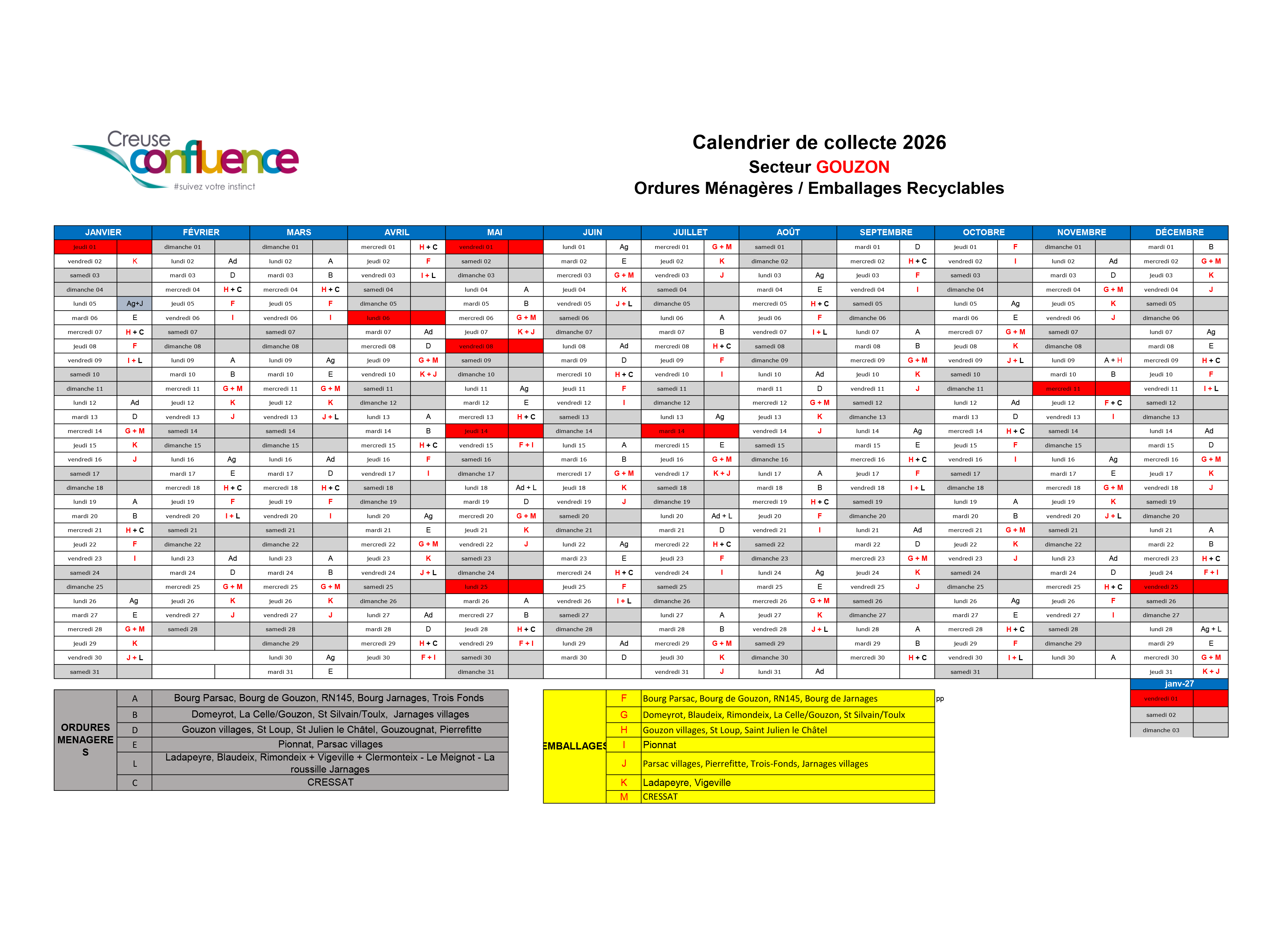 CALENDRIER RAMASSAGE DES POUBELLES 2026